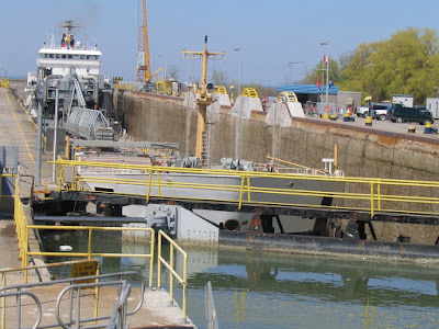 There are 8 locks on this canal, this is #7 at Thorold, Ontario. This ship passing through was light, empty,... deadheading from emptying or to load up ahead and return or go on ahead. This ship clearing the #7 Lock is heading north onto Lake Ontario. I'd like to see the shipping manifest to see where it was headed; no telling. Northern direction would have gone up the St Laurence Seaway,... Through the Northumberland Straight, up around Cape Breton, and out into the North Sea past Newfoundland.